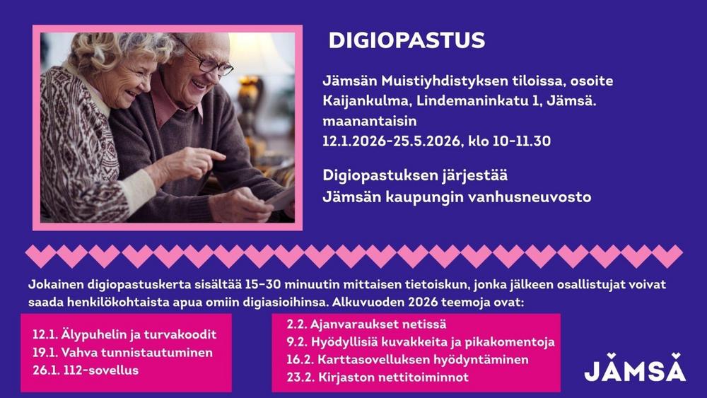 Viikoittainen digiopastus jatkuu maanantaisin 12.1.–25.5.2026 klo 10–11.30 Jämsän Muistiyhdistyksen tiloissa (Kaijankulma, Lindemaninkatu 1). Maksuton ja kaikille avoin opastus tarjoaa apua älypuhelimen, tabletin ja tietokoneen käyttöön. Ajanvarausta ei tarvita – voit tulla kerran tai useammin. Ota oma laite mukaan. Opastajina toimivat koulutetut vapaaehtoiset vertaisopastajat.