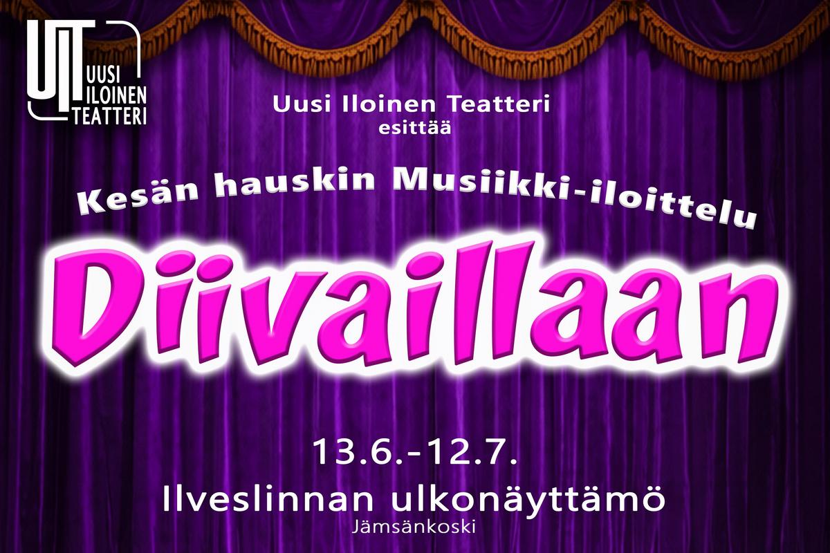 Totta se on!! Uusi Iloinen Teatteri valloittaa tulevana kesänä Jämsänkoskella! Legendaarinen UIT viihdyttää kesä-heinäkuussa historiallisen Ilveslinnan katetulla ulkoilmanäyttämöllä. Ennennäkemätön ja vauhdikas Musiikki-iloittelu Diivaillaan tarjoaa säihkyvän parituntisen hulvattoman huumorin ja tietysti upeiden musiikkinumeroiden parissa.