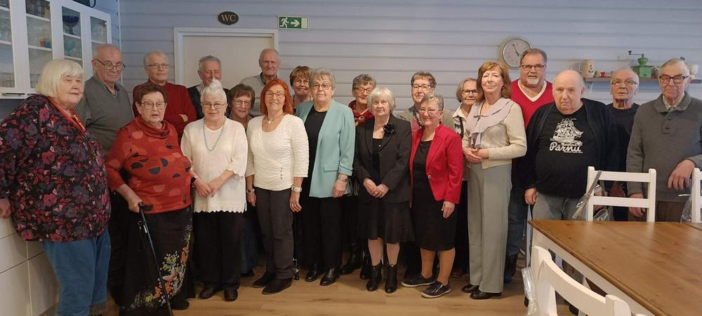 Juhlaporukkaa Ritarinkankaalla. Vuonna 2023 80 v, 85 v, 90 v täyttäneet jäsenemme ja kolme nuorisoryhmäläistä yhteisillä kakkukahveilla.